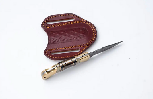Double Bar S Damascus Steel Pocket Knife | Leather Sheath